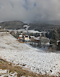Dimanche 3 mars : premiers petit déjeuners vers 8 h et chacun organise sa matinée. Nous quatre partons par les chemins forestiers à Lamoura. Visite rapide sous un soleil timide, retour via un autre chemin pour moi et par la route et le Lac pour Vonette, Olivier et Océane. Déjeuner au gite.
