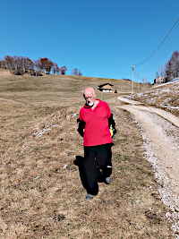 A 14 h je pars vers le téléski de la Combe du Lac, passage près de fermes d’alpage. Il se met à neiger, je monte, elle devient de plus en plus drue et la couche s’épaissit ,entre 10 et 15 cm au sommet au départ de la piste verte et d’une bleue de liaison vers La Serra. J’ entreprends mon retour par un autre itinéraire et arrive au chalet à 15 h 45.