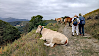 La descente est plus relax, certaines portions de chemins sont très largement jalonnées de bouses de vaches . Le retour aux voitures a lieu à 14 h 15. Belle journée , paysages variés , nous sommes entourés de collines, quelques rencontres avant retour au gite.
